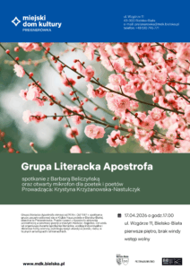 W piątek 20 marca 2026 r. spotkaliśmy się w Preisnerówce na kolejnej cyklicznej imprezie Grupy Literackiej Apostrofa w wiosennej atmosferze. Prowadzącą spotkanie była przewodnicząca grupy Krystyna Krzyżanowska – Nastulczyk.